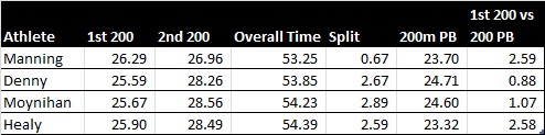 Also, in comparison was the athlete's first 200m versus their 200m PB. Manning was 2.59 outside her 200m PB at 200m. Denny (0.88) and Moynihan (1.07) were probably more typical while an under par Healy was slower through 200m than normal.